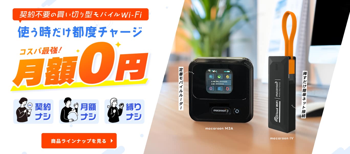 端末を購入し、データチャージするだけでWi-Fi利用が可能なので、SIMカードの契約等の面倒な手続きは一切不要です。