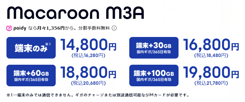 料金 | 端末:17,600円 端末(30GB付き):19,800円 端末(100GB付き):23,100円 |