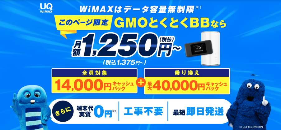 WiMAXは5G対応の高速通信が可能なうえ、Broad WiMAXなら高額キャッシュバックやスマホセット割(au/UQモバイル)が適用されるため、「通信速度の速さ」と「実質料金の安さ」のバランスが全サービスの中で最も優秀です。