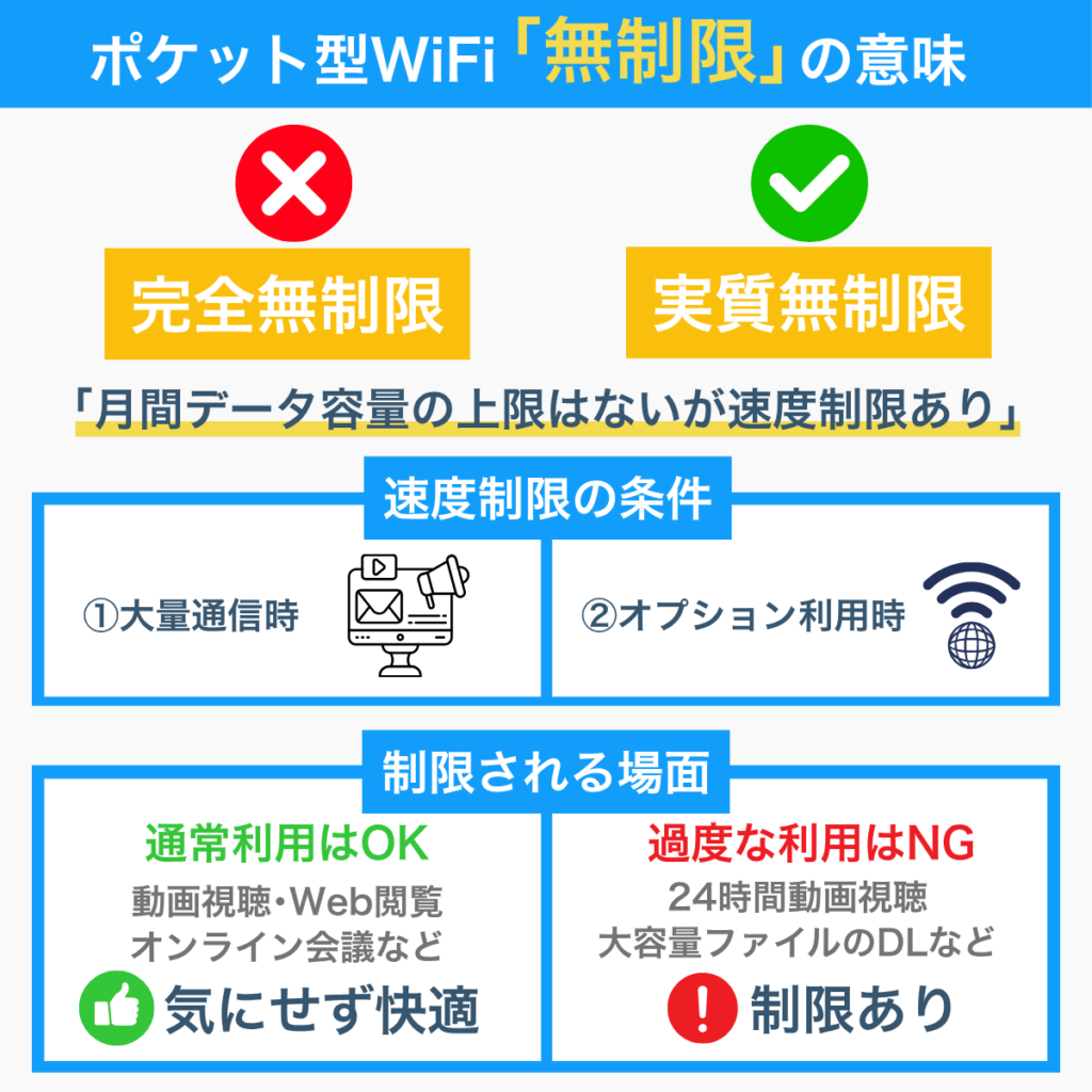 【前提】ポケット型WiFiは「完全無制限」ではなく、大量通信時に速度制限の可能性がある「実質無制限」