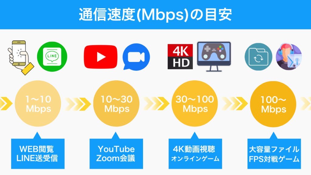 「サイトの閲覧:1~10Mbps」「動画視聴、Web会議:10~30Mbps」「オンラインゲーム:1~70Mbps」